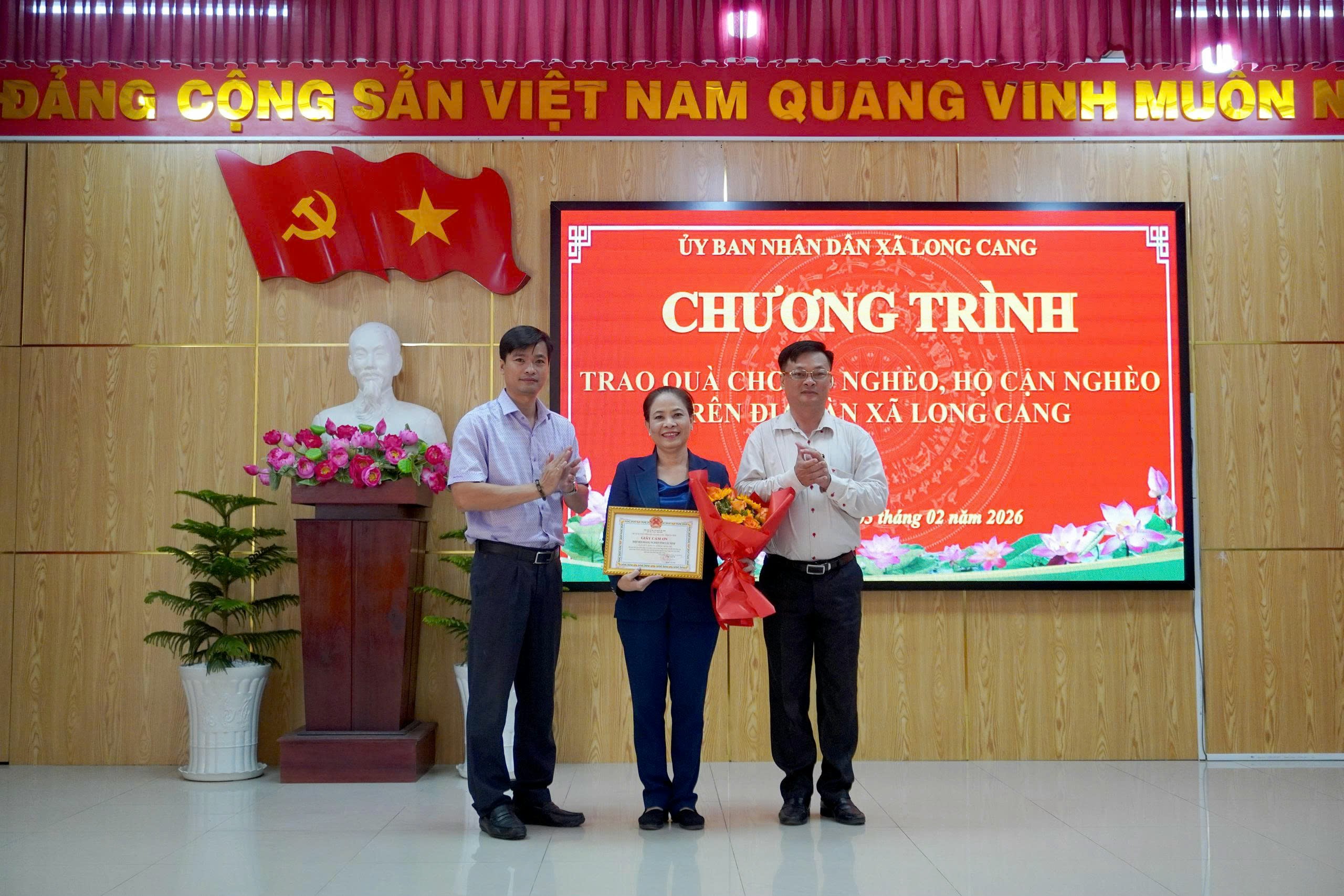 Ghi nhận những đóng góp tích cực của doanh nghiệp trong công tác an sinh xã hội tại địa phương, UBND xã Long Cang đã trao giấy khen và hoa cho các đơn vị tài trợ, thể hiện sự trân trọng đối với những nghĩa cử cao đẹp vì cộng đồng.