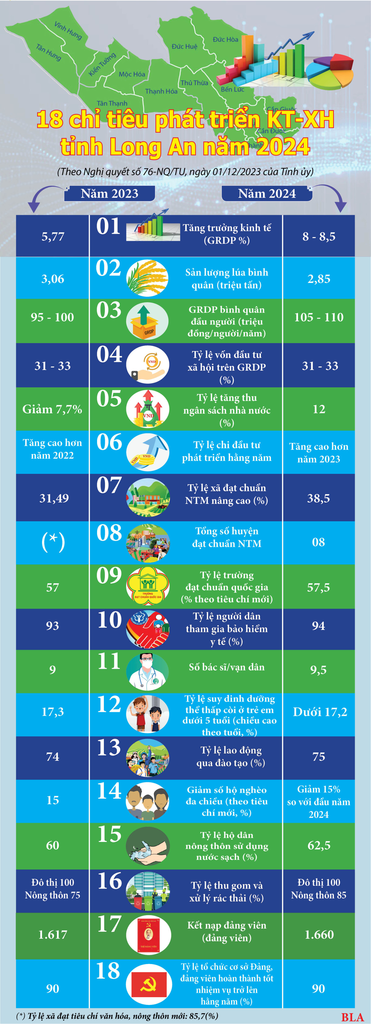 Năm 2024 là năm có vai trò quyết định, tạo lực để tăng tốc phấn đấu hoàn thành thắng lợi trong triển khai thực hiện Nghị quyết Đại hội XI Đảng bộ tỉnh Long An và Đại hội XIII của Đảng. Trên cơ sở phân tích, đánh giá tình hình, nhận định các thuận lợi, khó khăn, cơ hội, thách thức cũng như kế thừa, phát huy truyền thống lịch sử và những kết quả tích cực đạt được, cùng với tinh thần đoàn kết, thống nhất, nỗ lực, quyết tâm cao nhất, Tỉnh ủy thống nhất xác định 18 chỉ tiêu chủ yếu trong năm 2024.