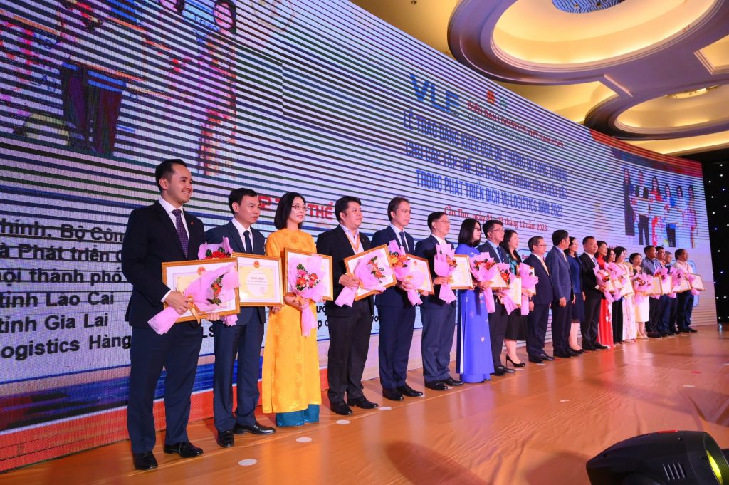 Ông Võ Quốc Huy – Chủ tịch HĐQT Cảng Quốc tế Long An (bìa trái) cùng các tập thể, cá nhân nhận Bằng khen của Bộ Công thương tại VLF 2023.