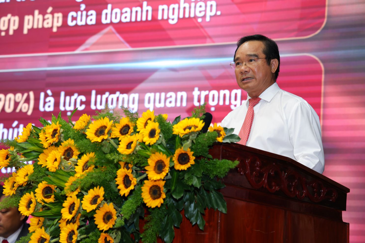 Ông Võ Tân Thành, Phó Chủ tịch VCCI, đã gửi lời chúc mừng và biểu dương những nỗ lực đáng ghi nhận của LBA trong nhiệm kỳ qua. Cộng đồng doanh nghiệp tỉnh Long An đã không ngừng phát huy tinh thần vượt khó, năng động, sáng tạo, góp phần vào sự phát triển toàn diện của tỉnh nhà cũng như đóng góp tích cực vào sự phát triển kinh tế đất nước. Đặc biệt trong giai đoạn 2020 – 2022, khi toàn cầu phải đối mặt với đại dịch COVID-19 và những thách thức chưa từng có, dưới sự dẫn dắt kiên định của Hiệp hội Doanh nghiệp tỉnh Long An, cùng tinh thần đoàn kết, đồng lòng, các doanh nghiệp không chỉ nỗ lực duy trì hoạt động sản xuất, kinh doanh trong giai đoạn khó khăn nhất, mà còn sáng tạo, thích ứng linh hoạt với các thay đổi của thị trường, tiếp tục tăng trưởng trong bối cảnh đầy thách thức. Ông nhấn mạnh rằng Hiệp hội đã làm tốt vai trò là cầu nối, hỗ trợ các doanh nghiệp liên kết, hợp tác, cũng như phản ánh kịp thời những khó khăn, vướng mắc của cộng đồng doanh nghiệp đến các cơ quan quản lý trung ương và địa phương, góp phần tạo nên môi trường kinh doanh thuận lợi và nâng cao năng lực cạnh tranh cho các doanh nghiệp tỉnh Long An.