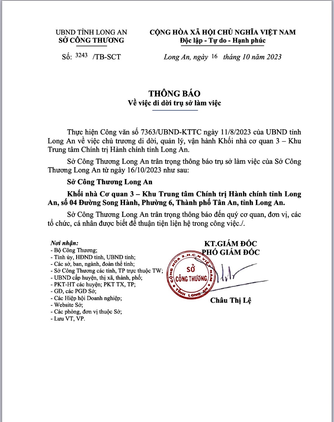 Sở Công Thương Long An đã có Thông báo số 3243/TB-SCT ngày 16/10/2023 về việc di dời trụ sở làm việc của Sở Công Thương Long An từ ngày 16/10/2023 như sau: