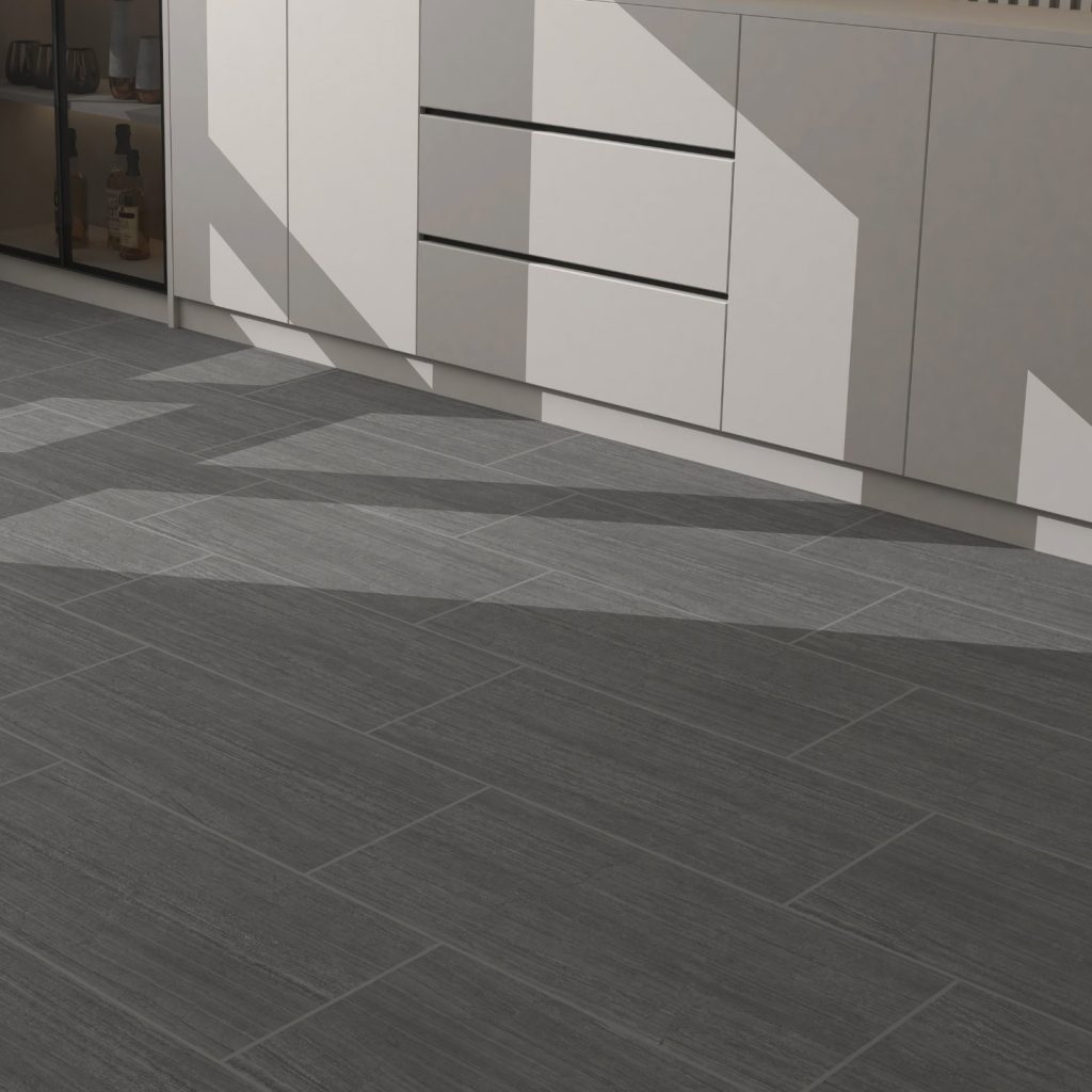 Mã sản phẩm Noble 004 & 005 với các đường vân thẳng cùng màu xám loang tạo nên một hiệu ứng của đá trầm tích nghìn năm, thu hút mọi ánh nhìn