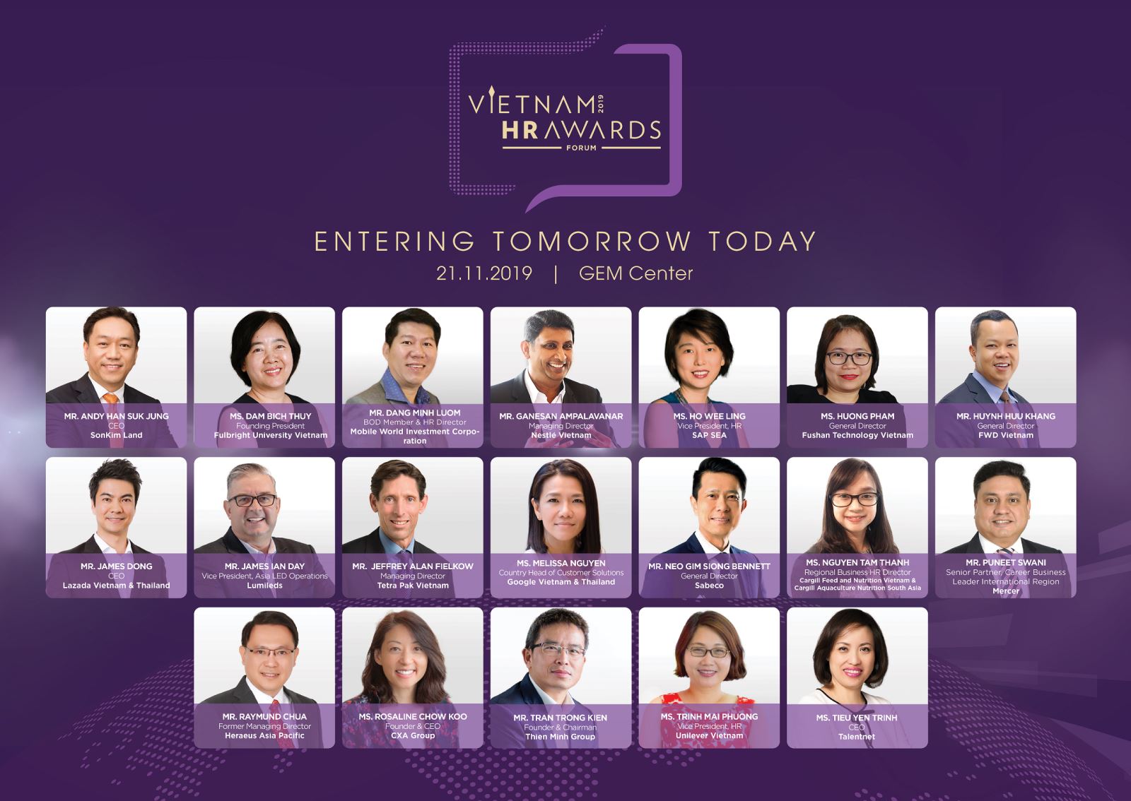 Với chủ đề Entering Tomorrow Today – Chạm bước tương lai, sự kiện mang đến 15+ diễn giả là những CEO và lãnh đạo danh tiếng để cùng phân tích, chia sẻ chia sẻ những chiến lược kinh doanh và khuynh hướng quản trị nhân sự đột phá trong bối cảnh thời đại mới: